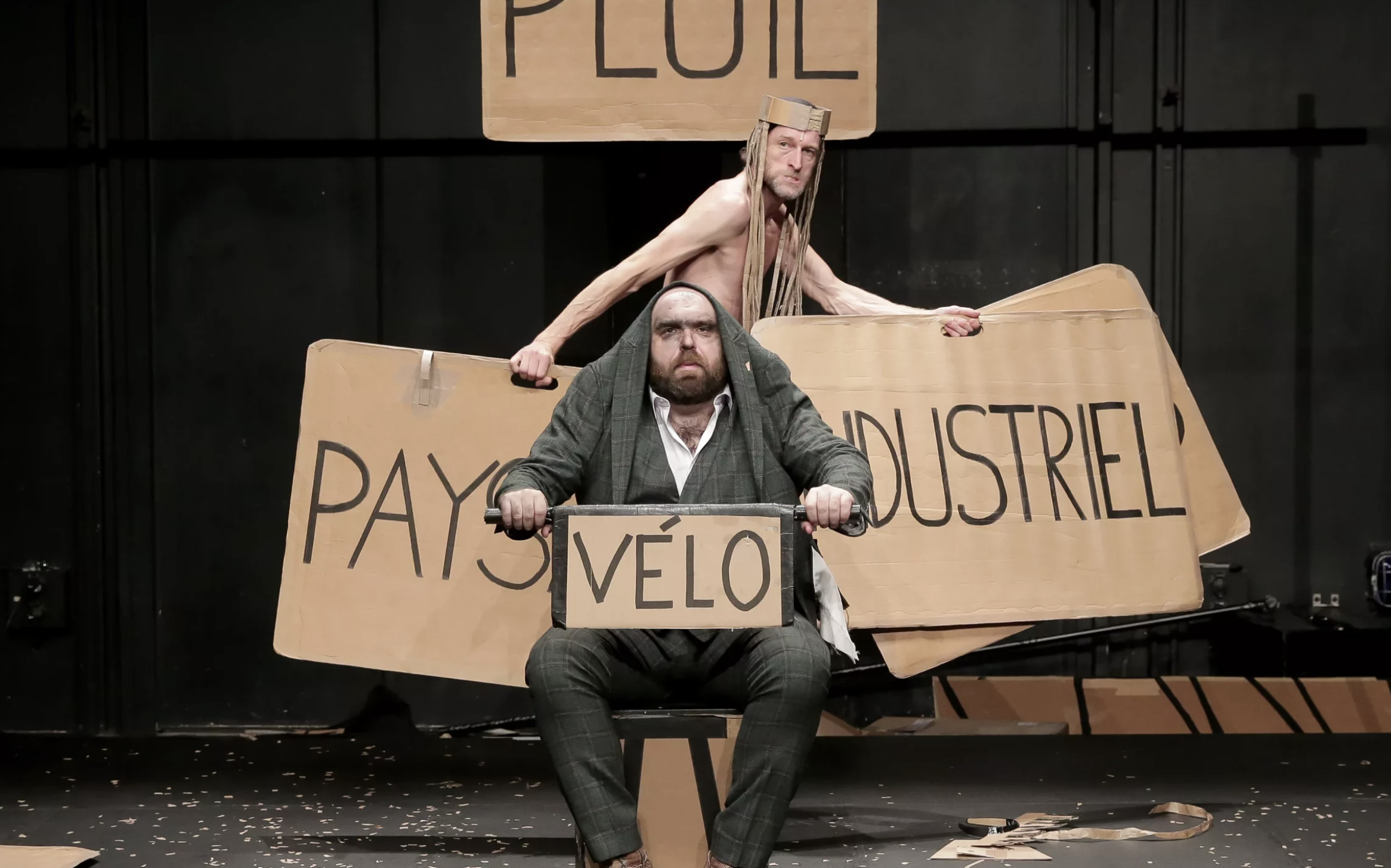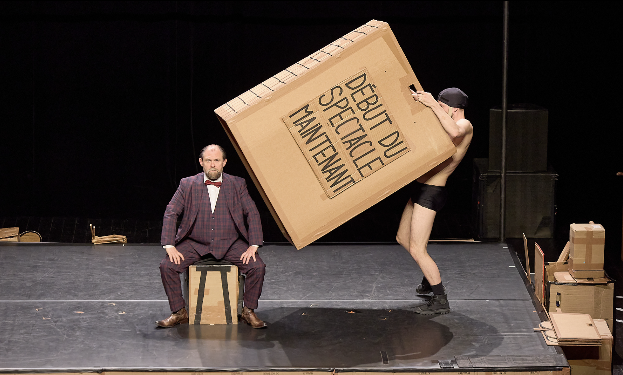 Le personnage principal reste assis sur un carton pendant tout le spectacle tandis que son acolyte déploie ses cartons commentaires, accessoires ou indications géographiques avec une précision phénoménale.